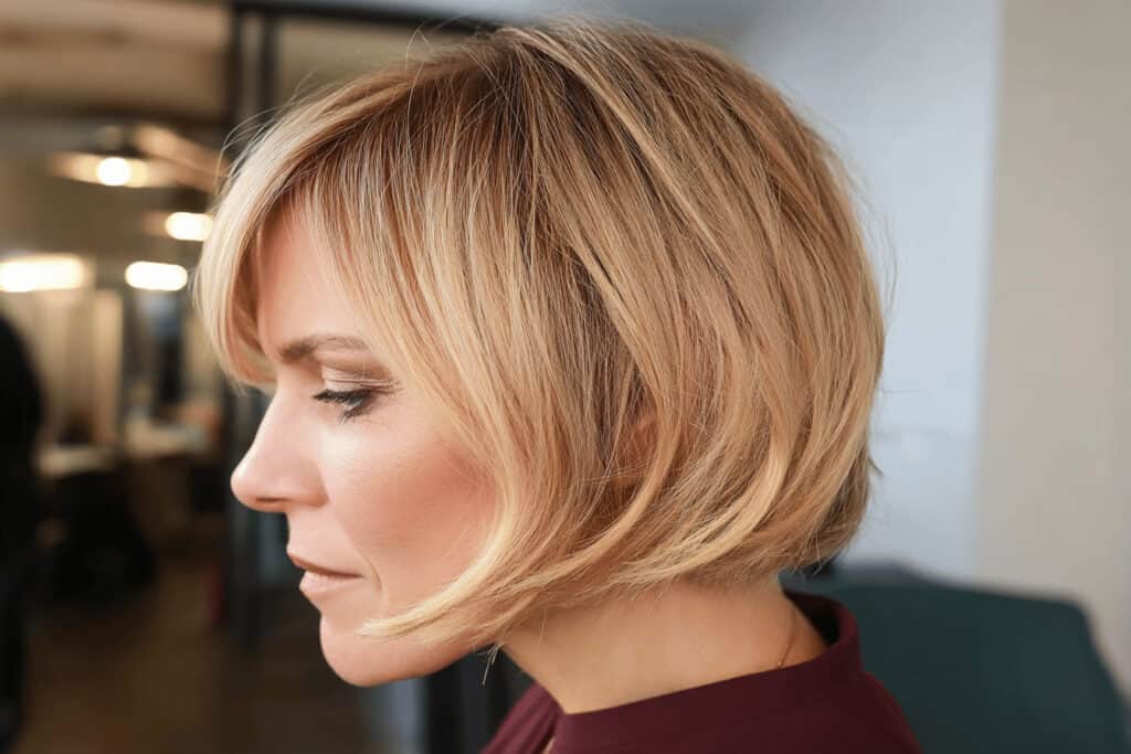 Um diesen Look zu kreieren, schneide deinen Bob auf Kinnlänge und lasse die Ponyfransen sanft ins Gesicht fallen. Verwende ein Glätteisen, um ein geschmeidiges Finish zu erzeugen. Die Struktur des Bobs kannst du mit einem leichten Texturspray betonen.