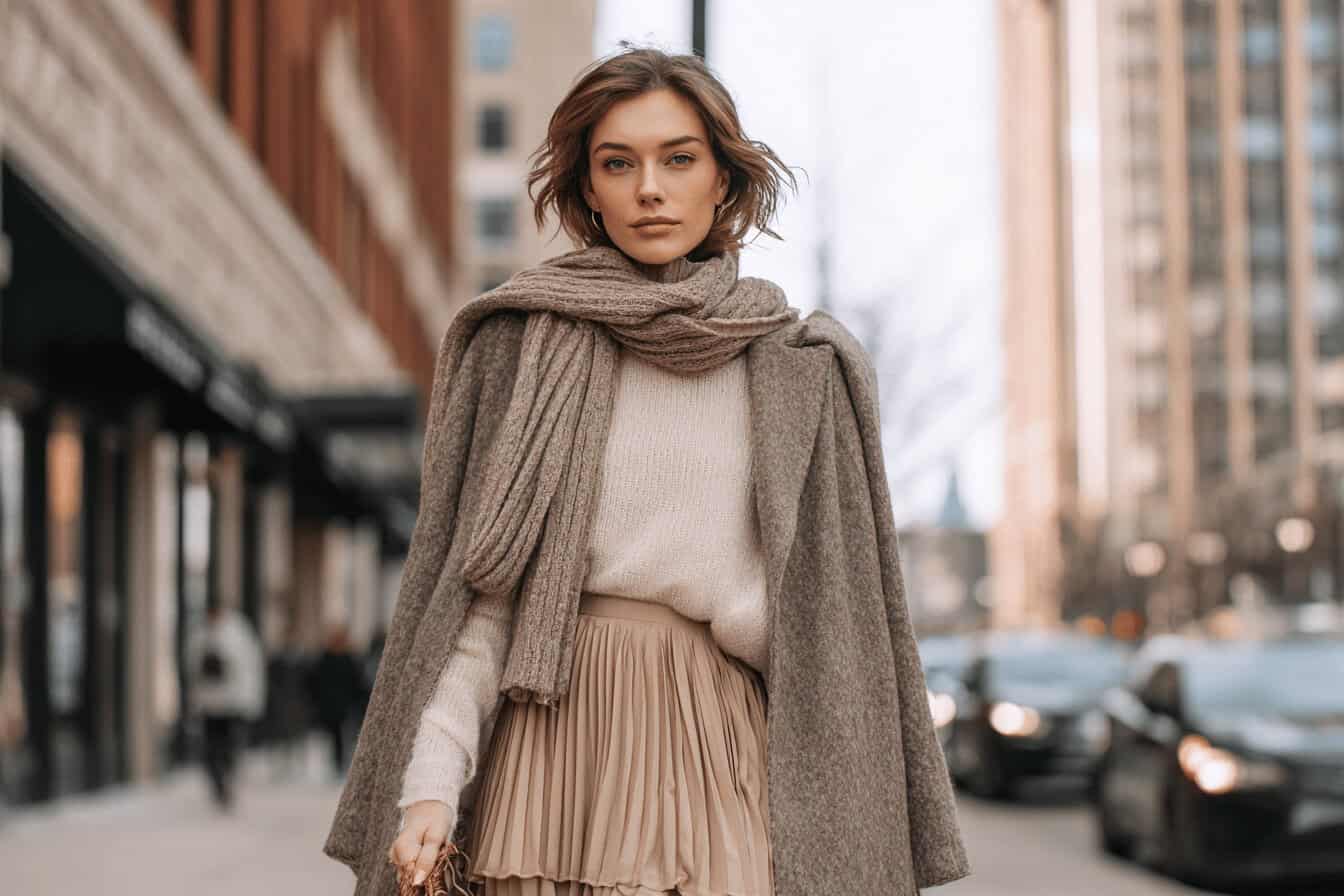 Wünschst du dir ein Winteroutfit, das gleichzeitig gemütlich und stilvoll ist? Ein monochromer Faltenrock-Look bringt genau diese Leichtigkeit in die kalte Jahreszeit – ohne farblich zu überladen.
