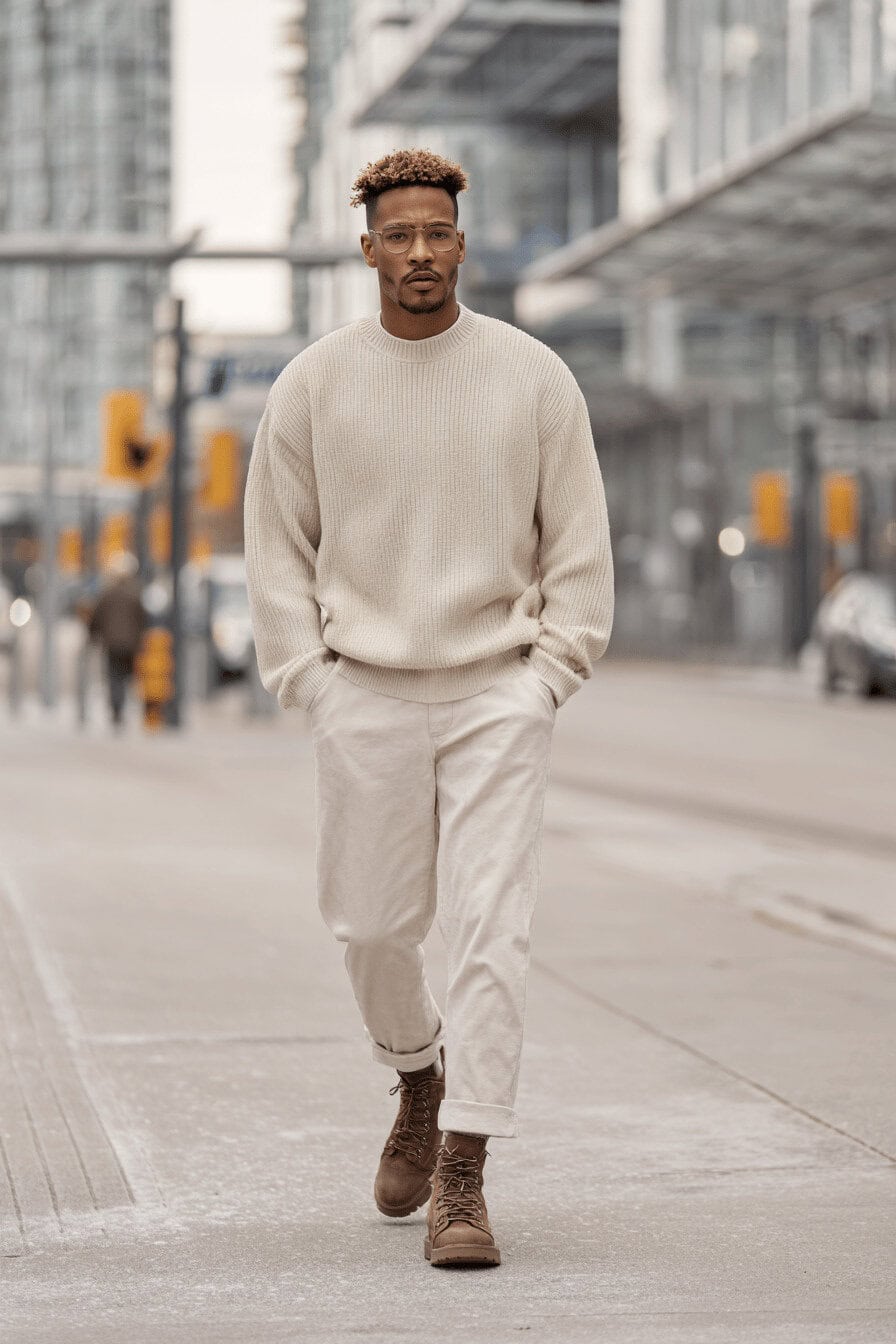 Wünschst du dir einen Winter-Look, der funktional und gleichzeitig entspannt wirkt? Diese Kombination aus Oversized Pullover, Double-Knee Pants und robusten Boots bringt genau das mit – ohne viel Aufwand.