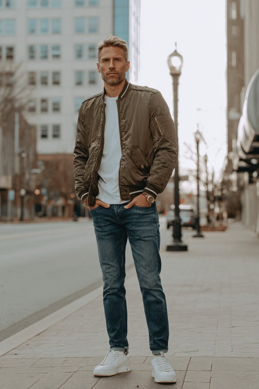 Du willst einen Look, der lässig wirkt, aber trotzdem gestylt rüberkommt? Genau das schafft das Outfit mit Racing-Jacket, schmaler Jeans und weißen Sneakers – ganz ohne Anstrengung.