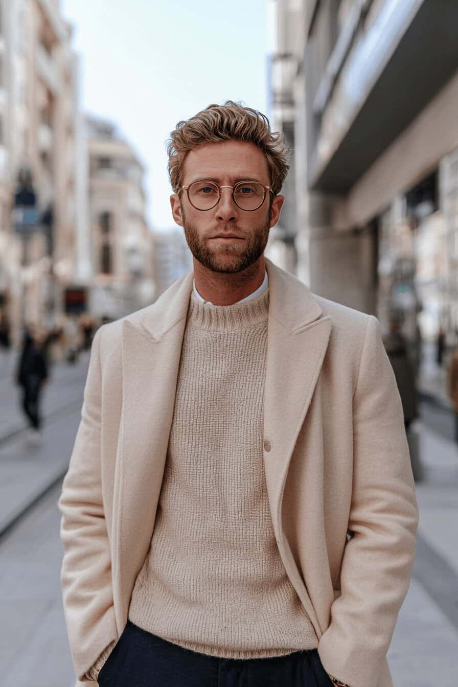 Beiger Mantel mit Kaschmirpullover und dunklen Chinos