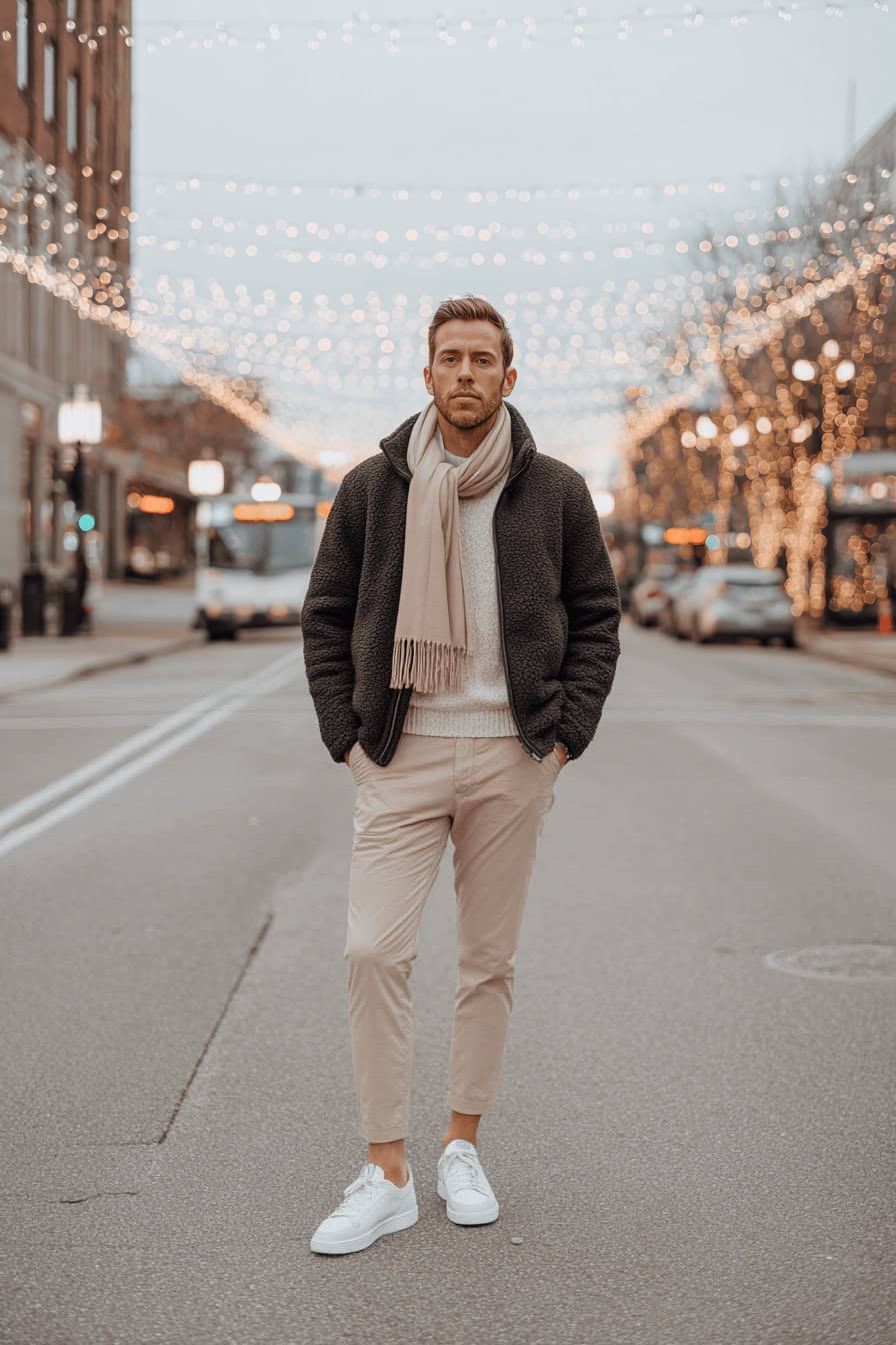 Die Fleecejacke wirkt nicht nur gemütlich, sondern bekommt durch die Kombination mit einer beigefarbenen Chino und cleanen Sneakern einen coolen, urbanen Vibe. Der helle Schal bringt zusätzlich Struktur und zieht den Look optisch in die Länge.