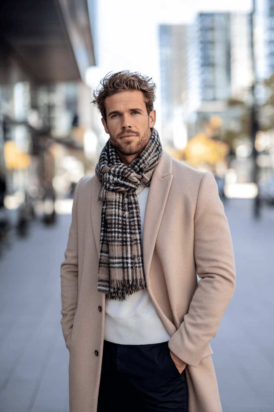 Der karierte Schal ist nicht nur funktional, er gibt deinem klassischen Wollmantel mehr Tiefe und Struktur. Kombiniert mit dunkelblauen Chinos bleibt der Look ausgewogen und modern – perfekt für City-Walks oder ein entspanntes Treffen im Café.