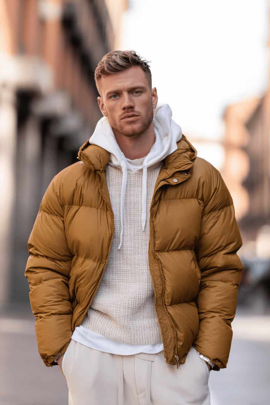 Die Kombination aus Puffer Jacket und Hoodie ist nicht nur praktisch, sondern sieht auch verdammt gut aus. Der Look wirkt entspannt, ohne dabei nach Jogginganzug auszusehen – der Trick liegt in der Farbabstimmung und den richtigen Proportionen.