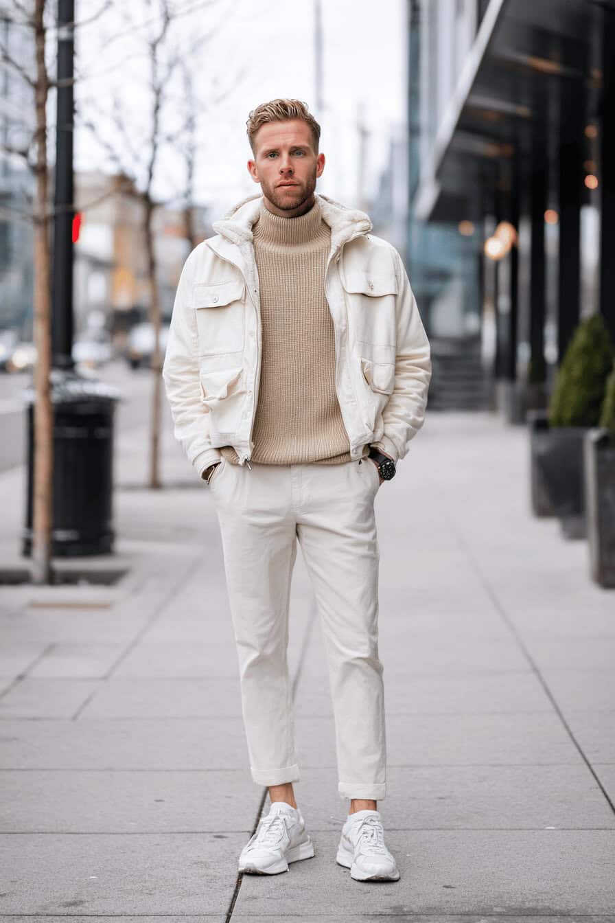 Die helle Racing-Stripes Jacke wirkt sportlich und funktional, während Rollkragenpullover und Chino eine ruhige Linie bringen. Weiß auf Beige wirkt nicht langweilig – im Gegenteil: Es schafft Tiefe durch minimale Kontraste. Die Chunky-Sneakers greifen die sportliche Note wieder auf und runden den Look clean ab.