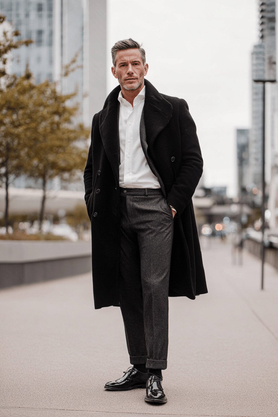 Schwarzer Wollmantel mit weißem Hemd und Anzughose