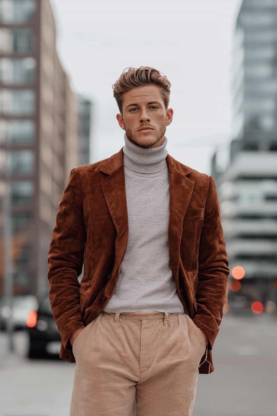 Wildleder-Blazer mit Rollkragen und Cordhose