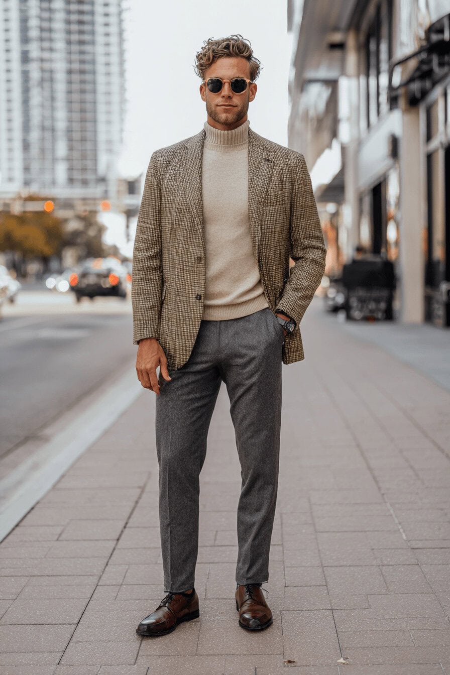 Ein kariertes Sakko gibt dem Outfit Substanz und sorgt für einen klassischen Touch. Darunter passt ein cremefarbener Rollkragenpullover, der warm hält, aber dabei schlank wirkt. Kombiniert mit einer melierten Stoffhose und braunen Lederderbys entsteht ein Look, der lässig genug für unterwegs, aber seriös genug fürs Büro ist.