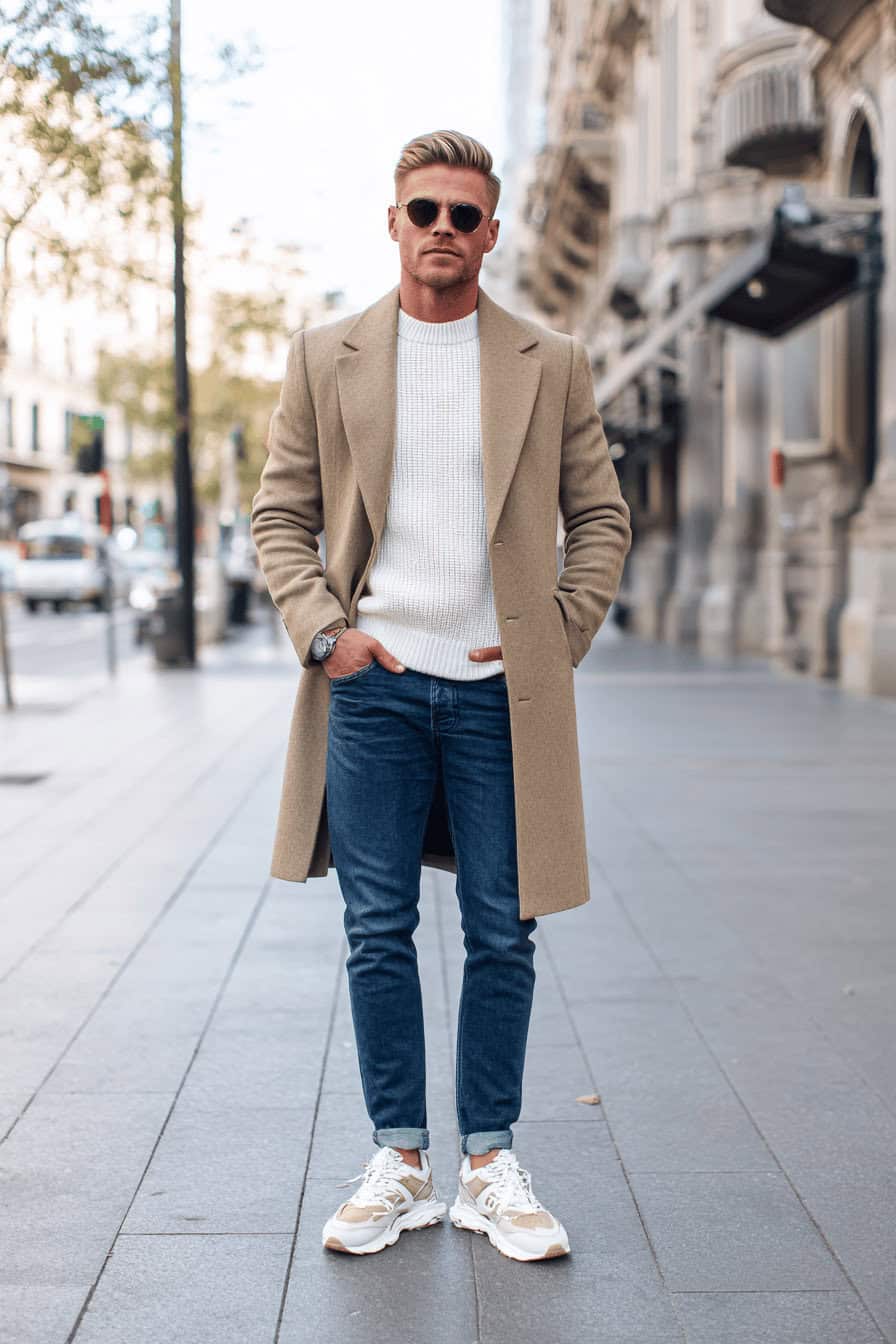 Der lange, beige Mantel bringt eine ruhige, elegante Note ins Spiel, während die weißen Chunky Sneakers dem Look einen jungen, sportlichen Twist verpassen. In Kombination mit der dunkelblauen Slim-Fit-Jeans entsteht ein stimmiges Gesamtbild, das lässig und citytauglich zugleich ist.