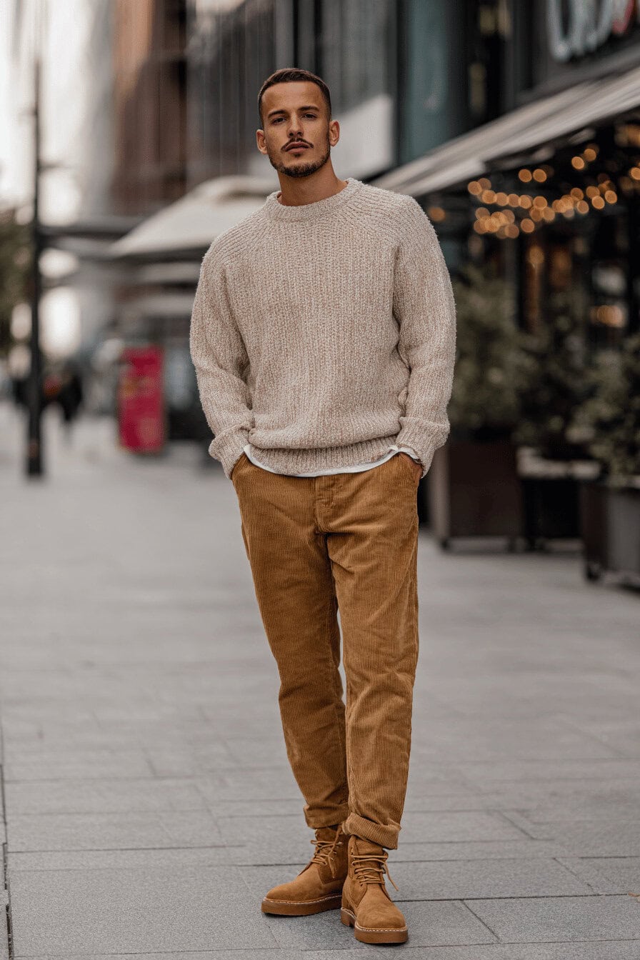 Das Zusammenspiel aus warmen Brauntönen und der natürlichen Struktur von Cord macht diesen Look so gemütlich wie stilbewusst. Ein grob gestrickter Pullover in neutralem Beige bringt Ruhe rein – und du wirkst automatisch entspannt. Bonus: Die Wildleder-Boots schaffen Bodenhaftung und runden das Outfit rustikal ab.