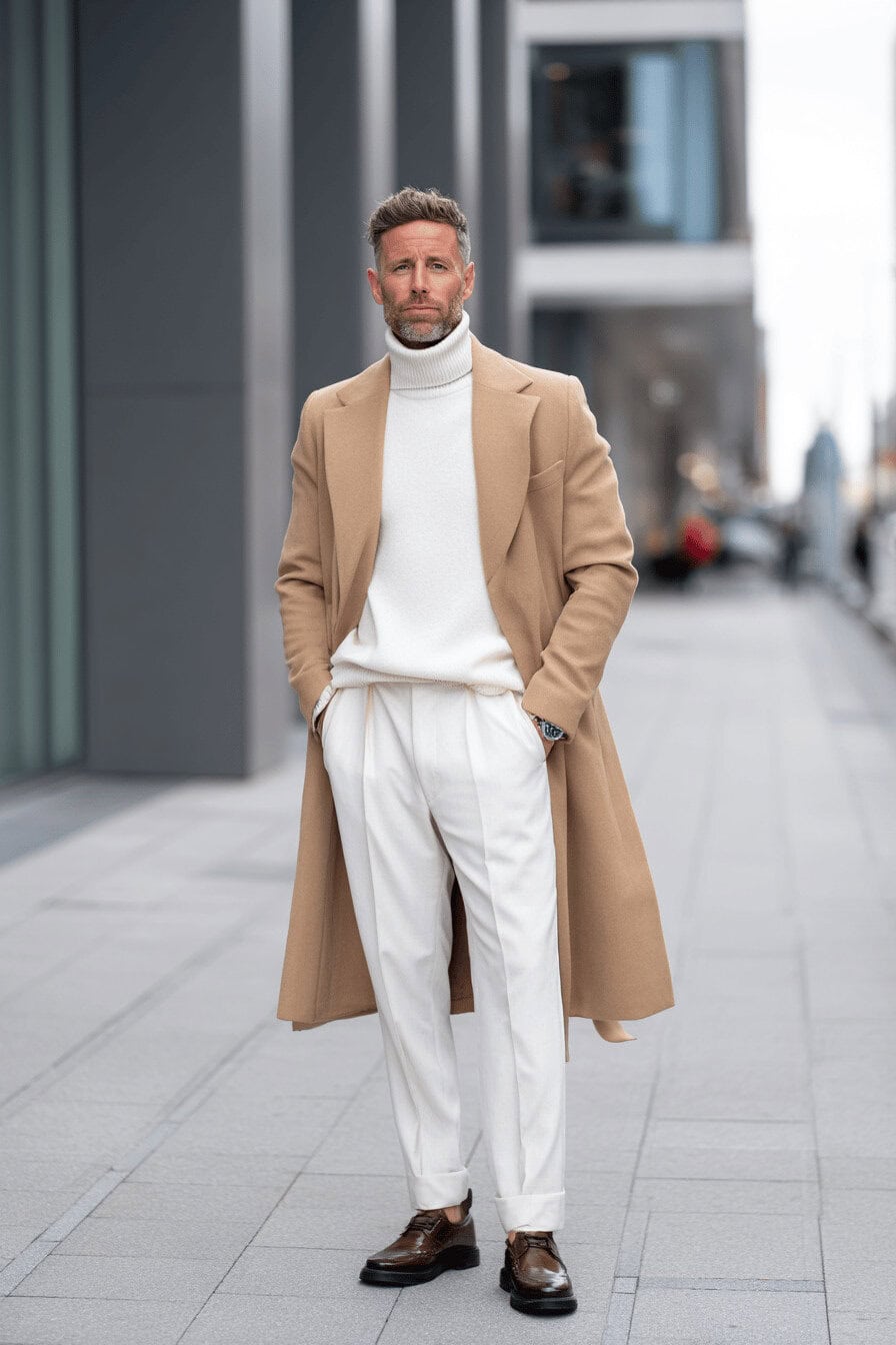 Ein weißes Rollkragensweater und eine locker fallende Stoffhose wirken clean und aufgeräumt. Der Camel Coat bricht das helle Gesamtbild ganz subtil und bringt Wärme rein. Achte besonders auf die Passformen – der Look lebt vom richtigen Schnitt und hochwertigen Materialien.