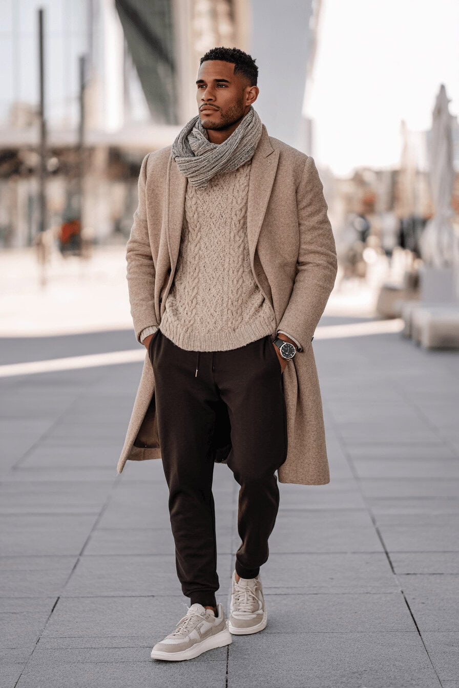 Ein grob gestrickter Pullover im Oversized-Look bietet nicht nur Wärme, sondern auch Charakter. Kombiniert mit einem langen, beigen Mantel entsteht ein Look, der urban und dennoch edel wirkt. Die Jogginghose bleibt dezent und harmoniert durch Schnitt und Farbe mit dem Rest des Outfits.