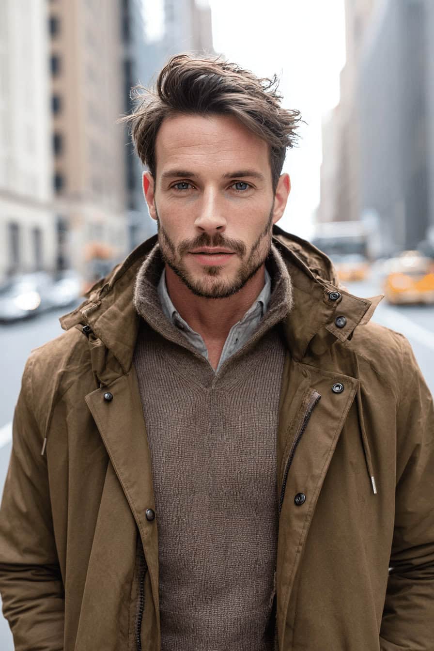 Die Kombi aus einem leichten Hemd, kuscheligem Pullover und wetterfestem Parka funktioniert besonders gut in der Stadt. Farblich harmonieren gedeckte Töne wie Khaki, Braun und Grau – sie wirken ruhig, erwachsen und sind leicht kombinierbar. Damit bleibt dein Look trotz Mehrlagigkeit stilvoll und nicht überladen.